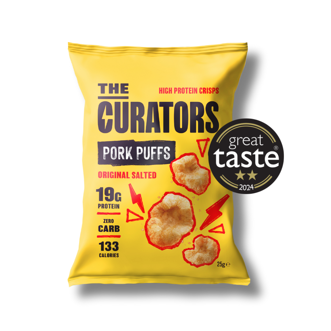 A delicious mixed box of all of your favourites. Original Salted, Smoky Bacon, Tajin and Sea Salt & Cider Vinegar Pork Puffs.